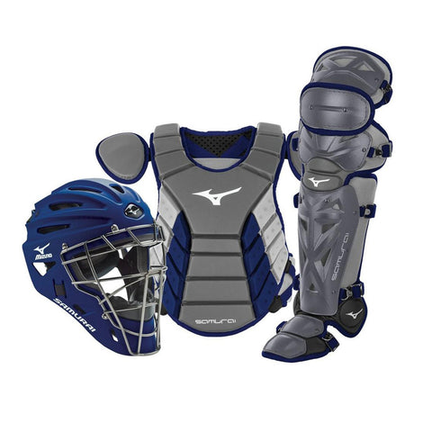 Mizuno's top-selling Samurai catcher's gear series with the convenience of having everything you need boxed for you in a complete set. Made with high-quality materials and full of innovative design details, Samurai gear is highly durable and made for high-performance and protection without compromising comfort. The Samurai Chest Protector is constructed with a Low Rebound Foam with a specially designed grippy surface to help keep balls in front of you. Shin Guards feature Mizuno's patented K-Pad and a Triple Knee Cup construction for superior comfort and knee protection, while the Samurai Catcher's helmet is designed with a strategic ventilation system, 3-layer EVA foam padding, and a strong steel mask. The ultimate